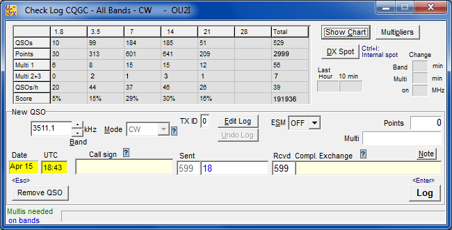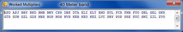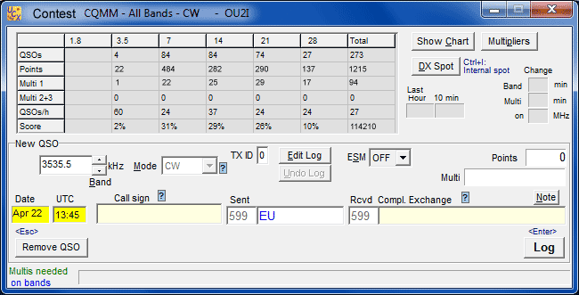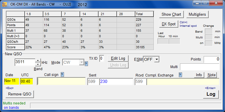 Min sidste QSO kørte jeg klokken 00.40 UTC hvor jeg kørte en enkelt QSO på 40M og fik en multiplier (Men 40M var åbent til USA og amerikanerne havde lettere ved at få fat i OK/OM end jeg havde :o)