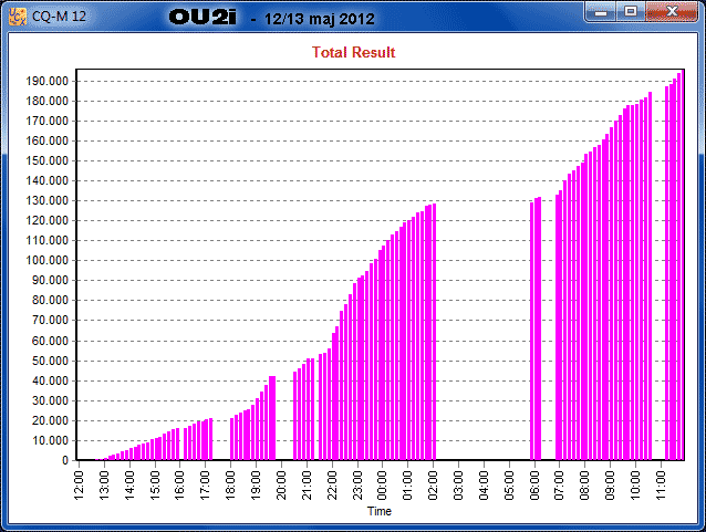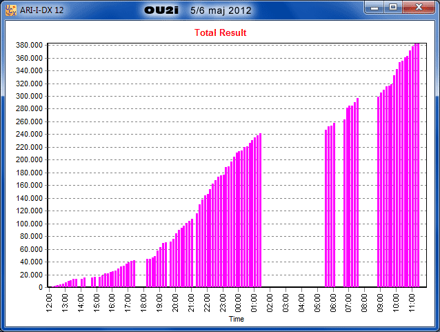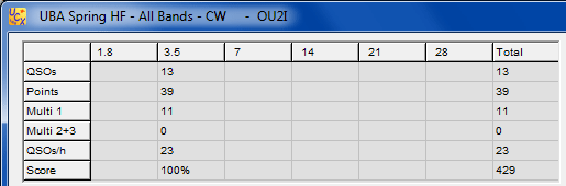 Det er lidt svært at få kontakt til centralEU-stationer med den vertikale antenne, men derimod gik det fint med USA, Nigeria, Canada, Australien og Malaysia. Men det var Ungarnske stationer som gav mange point og de eneste der talte som multiplier, så jeg fik ikke så højt et score som jeg kunne ønske mig.