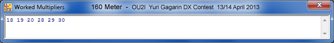 Udmærkede forhold fra start på 15M og mange aktive stationer. Også 10M viste sig fra den gode side søndag sidst på formiddagen. 160M gav flere god multipliers om natten frem til ca 02 UTC hvor jeg gik i seng og sov 3 timer. Da jeg kom i gang igen var der god aktivitet på 80M og især 40M.