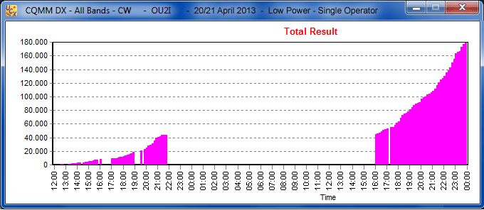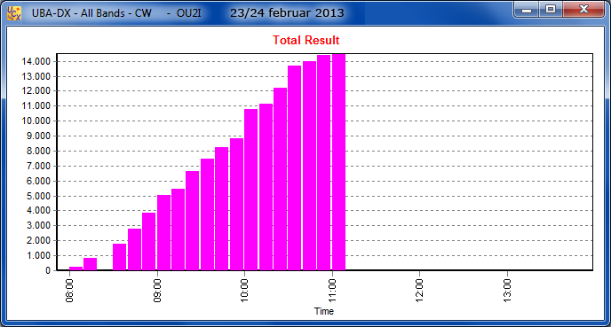 Mit resultat blev: 400 QSO'er - 150 mults - 208.650 point Aktiv i 9 timer Jeg hørte OZ2TS og havde QSO med OZ7EA - Og jeg havde QSO med den "hurtige" A71CM igen igen - han er herlig :o)