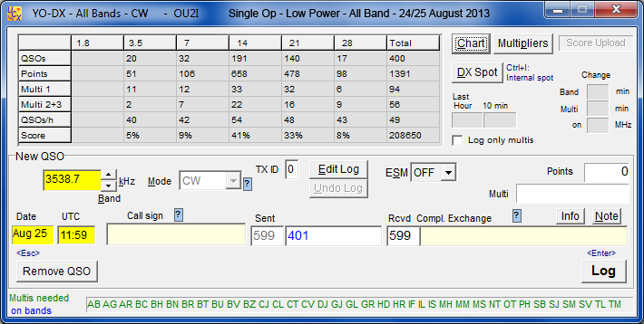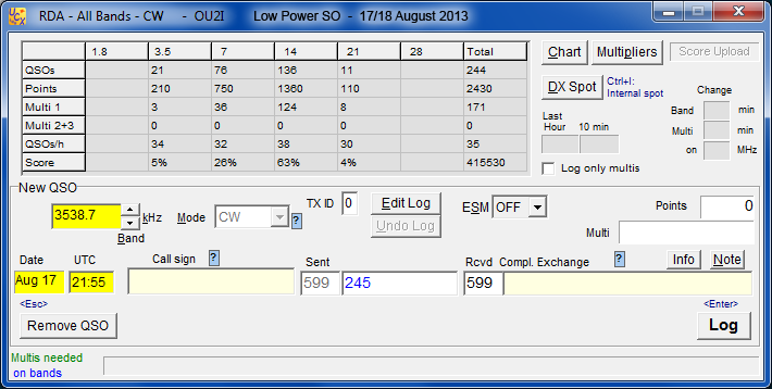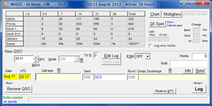 De tre høje bånd var svære at lave forbindelser på da de tyske stationer var meget svage og USA samt asiatiske stationer lå med kraftige signaler. Til gengæld gik det bedre på 80M og 40M hvor jeg havde lettere ved at komme igennem. Og især 40M var meget overfyldt og gav en rigtig god udfordring som jo gør det hele meget sjovere i Contester.