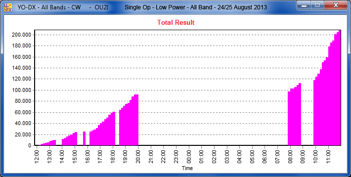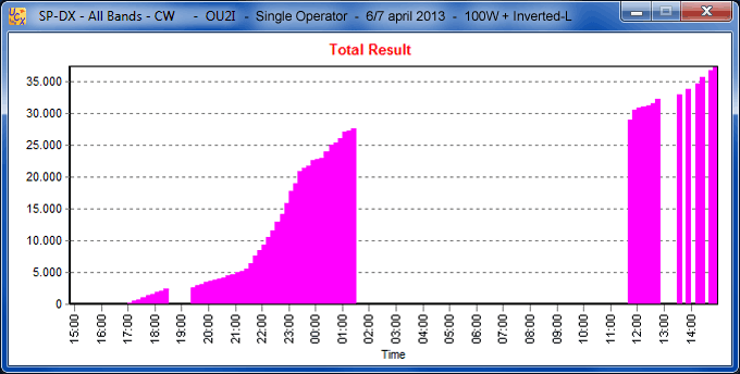 Mit resultat blev: 244 QSO'er - 171 distrikter - 415.530 point Aktiv i ca. 8 timer. Højeste rate 1,4 QSO/min. Jeg hørte OZ4FF OZ7EA OZ4CG