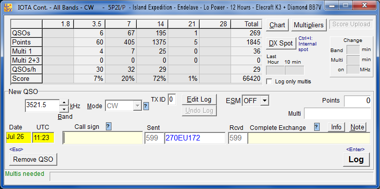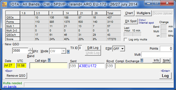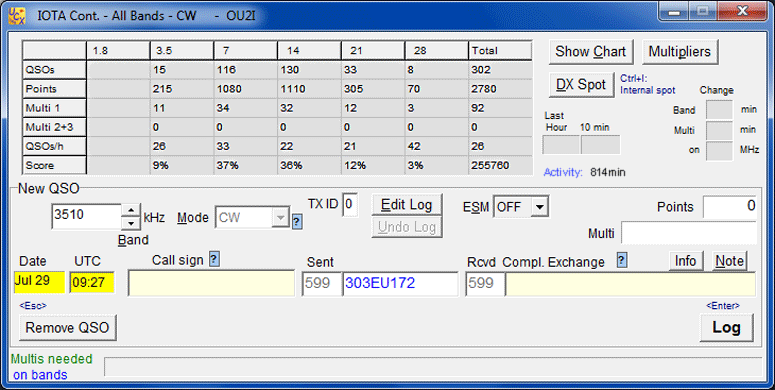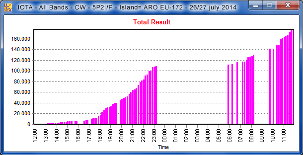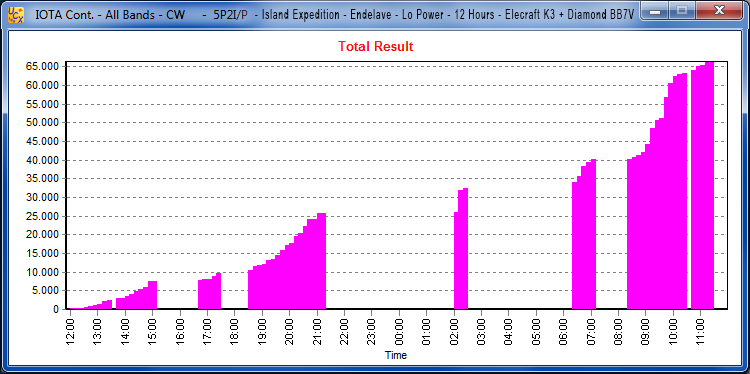 Mit score må jeg ha opnået ved at køre IOTA-stationer. IOTA stationer gav 15 point hvor andre stationer gav 5 point og IOTA-stationer var multipliers. Jeg tror det skyldes at jeg ikke lå på den samme frekvens og kaldte CQ - altså at jeg ikke kørte "RUN" men meget mere "S&P".
